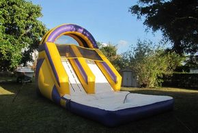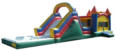 Bounce house with slide and pool area.